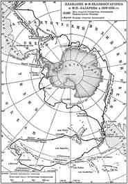 Карта экспедиции М.П. Лазарева и Ф.Ф. Беллинсгаузена 1819-1821 гг. «3 января 1820 года при редкой здесь ясной погоде русские подошли к Южному Туле – самому близкому к полюсу клочку суши, открытому Куком, и обнаружили, что эта «земля» состоит из трех высоких скалистых небольших островов, покрытых вечным снегом и льдом. П.М.Новосильский, высказывая, конечно, мысли своих старших товарищей, записал на следующий день: «…кажется, за Туле должны быть новые острова и, может быть, даже материк, иначе о...