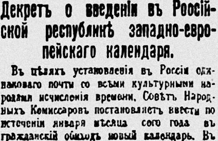 Народными комиссарами опубликован декрет о введение в России нового стиля, или, точнее, об устранении той разницы, на 12 дней, которая образовалась между исчислением времени по западно-европейскому и русскому календарю. ...
