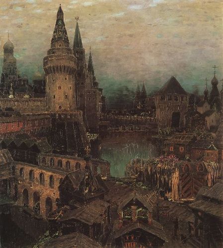 А.М.Васнецов. "Московский Кремль при Иване III". 1921. Величественные Кремлевские стены и башни равномерно воздвигнуты Иоанном: ибо древнейшие, сделанные в княжение Димитрия Донского, разрушились, и столица наша уже не имела каменной ограды Антон Фрязин в 1485 году, июля 19, заложил на Москве-реке стрельницу, а в 1488 другую, Свибловскую, с тайниками, или подземельным ходом; Италиянец Марко построил Беклемишевскую; Петр Антоний Фрязин две, над Боровицкими и Константино-Еленскими воротами, и третию Фроловскую; башня над речкою Неглинною совершена в 1492 году неизвестным Архитектором.