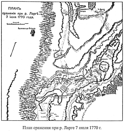«План кампании на 1770 год был составлен самим Румянцевым, добившимся от Императрицы невмешательства Петербурга в его распоряжения. Ошибки своего предшественника он резюмировал так: «никто не берет города, не разделавшись прежде с силами, его защищающими». Главной своей целью он положил уничтожение живой силы неприятеля, для сего 1-й армии надлежало действовать наступательно (воспрепятствовать переходу турок через Дунай), 2-й армии поручалась наступательно-оборонительная задача (овладение Бендерами и защита Малороссии), 3-я обсервационная армия упразднена и вошла отдельной дивизией в состав 1-й. Большие надежды возлагались на флот Орлова, которому из Средиземного моря надлежало проникнуть в Дарданеллы и угрожать Константинополю. Весть о приготовлениях хана к походу заставила Румянцева поторопиться с открытием кампании. Сознавая всю трудность удержания княжеств небольшими силами, он предписал Штофельну очистить Валахию и ограничиться лишь обороной восточной Молдавии, области между Прутом и Серетом. Не ожидая укомплектования, Румянцев выступил в поход, и 12-го мая его войска сосредоточились у Хотина. Под ружьем считалось (за исключением 5000 нестроевых и 2000 больных) — 32000, составивших 10 пехотных и 4 кавалерийские бригады. Пехота сведена в 3 дивизии — Олица, Племянникова и Брюса. Свирепствовавшая в Молдавии чума побудила было Румянцева остановиться в северной Бессарабии, однако критическое положение Молдавского Корпуса заставило его идти вперед. Значительная часть этого корпуса и сам Штофельн погибли от чумы. Принявший команду князь Репнин собрал остатки корпуса на Пруте у Рябой Могилы, где с 20-го мая стойко отбивал атаки татарской орды Каплан-Гирея (72000 человек). Высланный Румянцевым конный авангард генерала Баура вошел в связь с Репниным 10-го июня. Главные силы, задержанные плохими дорогами, подошли лишь 16-го числа и в ночь на 17-е Румянцев, невзирая на крепкую позицию и превосходные силы турко-татар, атаковал их при Рябой Могиле и отбросил на восток — в Бессарабию. Сильно укрепленный татарский лагерь при Рябой Могиле был взят широким обходным движением. Наш урон всего 46 человек, неприятель оставил до 400 тел. Всякого рода препятствия — естественные и искусственные — затруднили преследование. Хан занял еще более сильную позицию на реке Ларга, где решил выждать прибытия главных сил визиря, переправлявшихся через Дунай, и конницы Абаза-паши (15000), шедшей от Браилова. У Румянцева за выделением частей для обеспечения тыла было не более 25000. Предугадывая намерение неприятеля, русский полководец решил разбить его по частям, не дожидаясь соединения всей 250-тысячной массы. 7-го июля на рассвете он атаковал 55000 турко-татар на Ларге и обратил их в бегство. Крымский хан бежал к озеру Ялпух, где простоял до конца кампании, потеряв дух и не проявляя активности. Подготовительные к бою движения Румянцев выполняет всегда ночью и атакует на заре. В ночных действиях всегда сказывается преимущество хорошо организованного и обученного войска над худо обученным, и Румянцев стремится это преимущество использовать. Наш урон на Ларге — 90 человек, неприятелей побито 1000 (в плен взято лишь 23), захвачен лагерь хана, 8 знамен, 33 орудия».