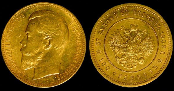 Российская монета достоинством в 35 рублей 50 копеек (100 франков). 1902 год