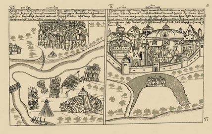 Фотолитография с рисунка в Кунгурской летописи. 1580—1585. Поход Ермака в Сибирь. Взятие города Кашлыка. 23—25 октября 1582.