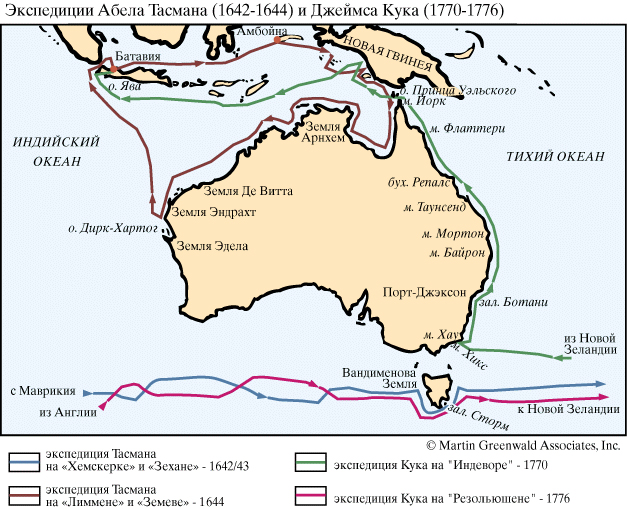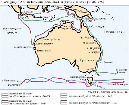 В 1770 году капитан судна «Индевор» Джеймс Кук высаживается на восточном побережье Австралии, которую называет Новый Южный Уэльс и объявляет владением Британской империи. «Индевор» недолго оставался в окрестностях залива Королевы Шарлотты. И сам корабль, и все, кто был на его борту, были в отличном состоянии, и у Кука не было причин медлить. Они выполнили все, что от них требовалось, и теперь им надо было возвращаться в Англию. Три возможных пути вели к дому. Поэтому Кук созвал свой обычный демократичный совет из офицеров и, как обычно, принял решение, соответствующее его желаниям. Они могли бы отправиться домой мимо мыса Горн, но это было долгое и опасное плавание. Кук сомневался, выдержит ли такелаж, который уже нельзя было назвать хорошим, штормы, к которым, без сомнения, надо готовиться в этом районе, к тому же запасы продовольствия были оценены как недостаточные на все это путешествие, а кроме того, в Южном полушарии наступала зима. Они могли бы пройти мимо мыса Доброй Надежды, но при этом возникала пугающая вероятность того, что «Индевор», который и в лучшие времена мог с большим трудом плыть против ветра, будет пробиваться нескончаемые недели сквозь преобладающие здесь западные ветры, прежде чем достигнет мыса. И тогда тоже возникнет вопрос с продуктовыми запасами. И кроме того, Тасман уже проделал это путешествие, а Кук не был человеком, который склонен идти по чьему бы то ни было пути. Третий же вариант, именно тот, который Кук в конце концов принял, был неизбежен. Для него он, должно быть, был особенно привлекателен, потому что предполагал новые достижения, новые открытия, изучение единственной полосы земли, оставшейся неисследованной в умеренном климате, — восточного побережья Австралии. Насколько Куку было известно, ни один европеец, кроме Тасмана, никогда не видел и не ступал на восточную часть этого континента, и этот вызов был ему по душе. (На самом деле Кук не знал — и так и умер в неведении, что именно он был первооткрывателем, потому что Тасман тоже не догадывался, что Земля Ван Димена, которую он посетил, была островом, отделенным от Австралийского материка.) И когда они достигли бы севера Австралии, то могли бы направиться к голландской Ост Индии, где, как предполагал Кук, можно было достать продовольствие в любом количестве. «Индевор» покинул Новую Зеландию 1 апреля. В намерения Кука входило плыть в сторону Земли Ван Димена — Тасман оставил достаточно точные координаты ее положения, но встречные ветры отнесли их далеко от предполагаемого курса, и когда они увидели землю, это была Австралия, а не Тасмания: так же как штормы помешали Куку заметить пролив Фово между Южным островом и островом Стюарта, теперь из за штормов они не заметили Бассов пролив между Тасманией и Австралией. Что же касается Кука, то он подумал, что заметил землю немного выше того места, где ее увидел Тасман. Важно отметить, что в силу удивительного совпадения Кук попал в случае с Бассовым проливом в такое же положение, что и Тасман с проливом Кука. На своих картах Тасман нанес Северный и Южный острова соединенными вместе, но в дневнике высказал предположение, что, возможно, имеется пролив, который их разделяет; Кук на карте изобразил Тасманию и Австралию соединенными вместе, но в своем дневнике выразил мнение, что, возможно, существует пролив, который их