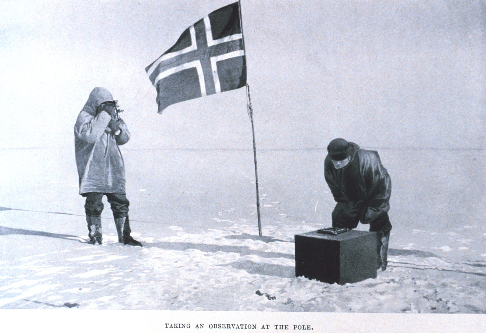 Амундсен велел застрелить тех собак, которые стали им не нужны, - "24 наших мужественных товарища", - поскольку теперь путь стал легче. Солнце больше не заходило, и покрытое снегом плоскогорье было залито ослепительным светом. Пять человек на лыжах летели вперед, словно участники олимпийского забега.14 декабря с помощью карт и секстанта они определили, что достигли заветной точки на белой равнине, на высоте 3000 метров над уровнем моря. Нетронутая снежная гладь, без малейших признаков того, что здесь кто-то побывал до них... Итак, дерзкая мечта стала реальностью: они покорили Южный полюс первыми!»