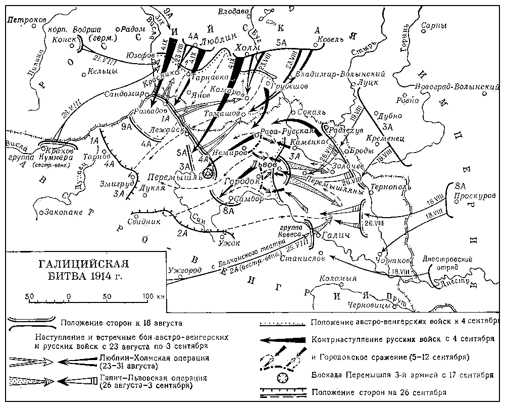Галицийская битва 1914 г. Карта из издания: Большая советская энциклопедия. — М.: Советская энциклопедия. 1969—1978.