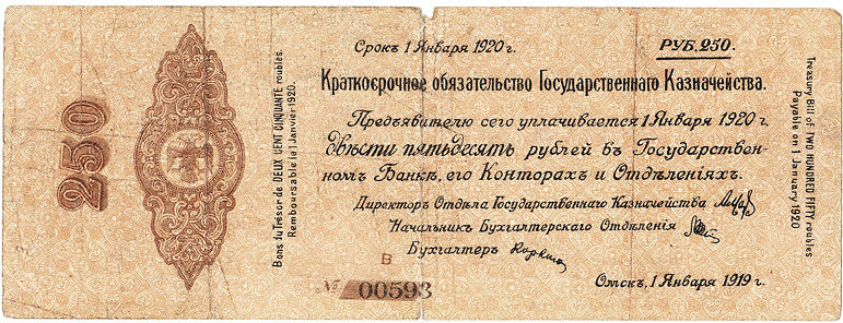 Самой многочисленной денежной эмиссией на территории востока России в период Гражданской войны являлся выпуск Краткосрочных обязательств Государственного Казначейства Российского правительства адмирала А.В. Колчака номиналами 25, 50, 100, 250, 500, 1000 и 5000 руб. Качество их изготовления было настолько низким, что «…выпуск одного и того же достоинства отличается бумагой, краской, шрифтом. Бывает до 22 образцов одной и той же купюры. <…> Бывает также, что деньги, полученные в Казначействе, не принимаются в Государственном банке»1. Это породило появление большого количества фальшивок. Ситуация дошла до того, что, не имея возможности улучшить качество выпускаемых обязательств, Государственный банк в соответствии с указаниями Министерства финансов был вынужден «снисходительно относиться к поступившим в кассы сомнительным обязательствам, если они недалеко отступали по исполнению от настоящих и не вызывали прямой уверенности в подделках»2.