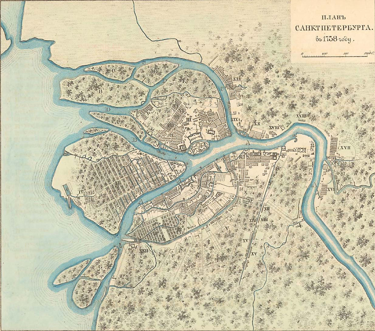 План Санкт-Петербурга 1738 года. Историческая реконструкция 1850-х гг. Из альбом: Планы С.Петербурга въ 1700, 1705, 1725, 1738, 1756, 1777, 1799, 1840, 1849 годахъ, съ приложенiемъ плановъ 13 частей столицы. Составлен Н.Цыловым. СПб., 1853