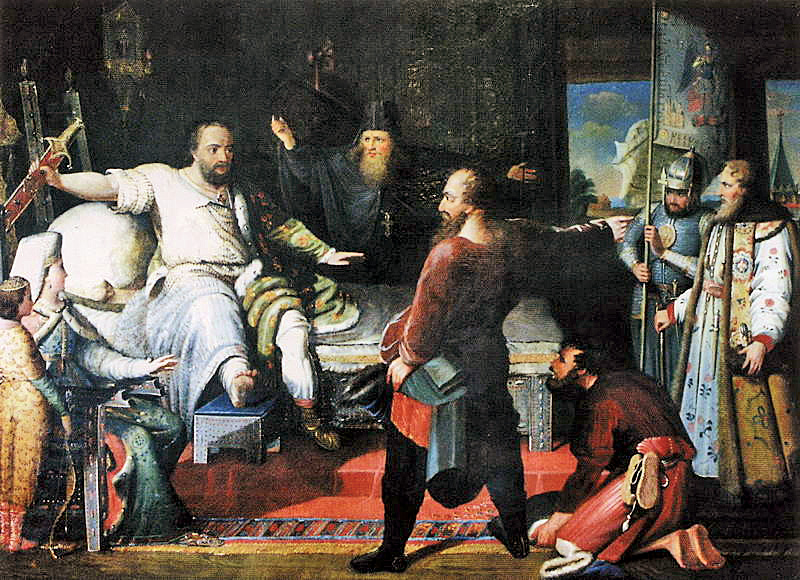 Архимандрит Печерского монастыря Феодосий с нижегородской депутацией у князя Пожарского. Художник неизвестен Холст, масло середина XIX века Краеведческий музей г. Балахна Нижегородская область, Россия Фрагмент. Смотреть полностью.