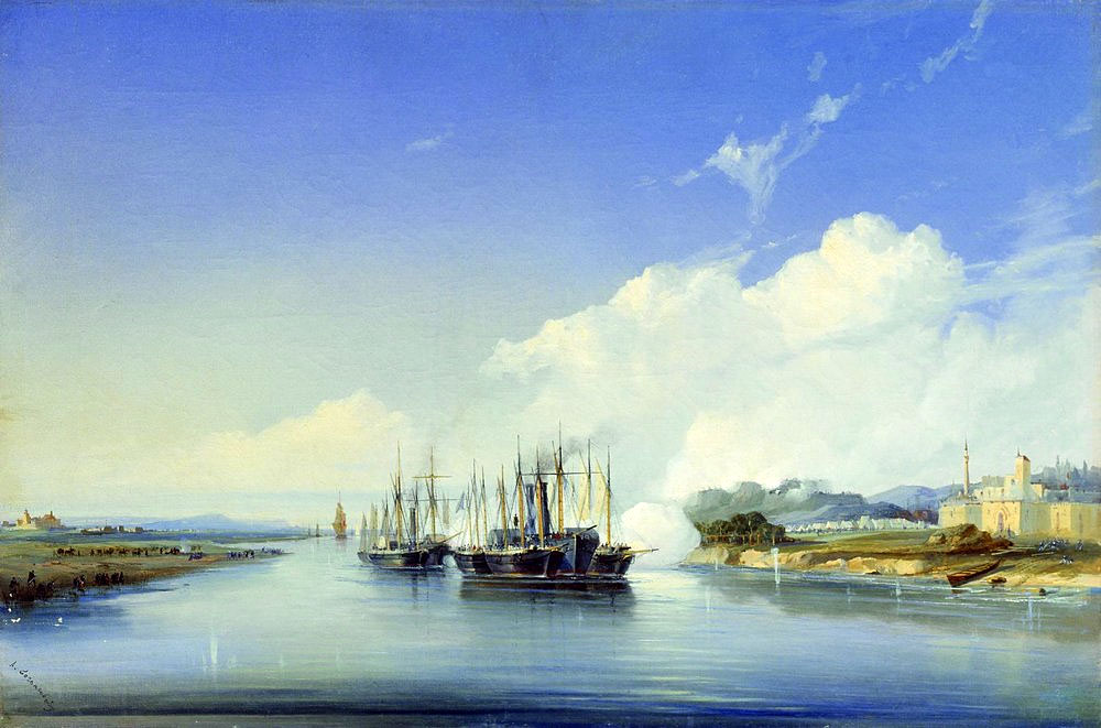 Обстрел пароходом "Прут" турецкой крепости Силистрия на Дунае 1854 года. Боголюбов Алексей Петрович (1824 - 1896) 46 x 70.5 см Холст, масло. 1856 Центральный военно-морской музей Санкт-Петербург Фрагмент. Смотреть полностью.