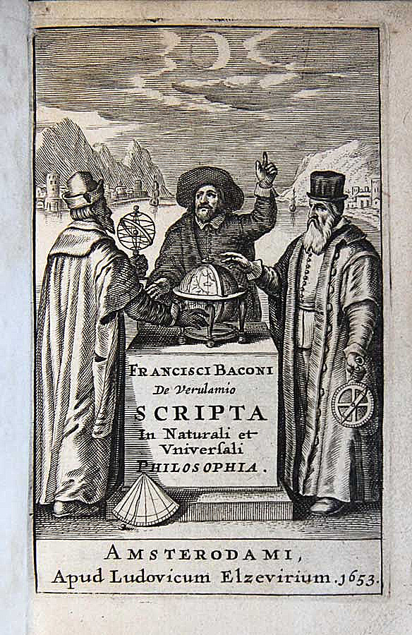 Френсис Бэкон Веруламский беседует с философами Фронтиспис книги Френсиса Бэкона «О достоинстве и преуспеянии наук» De Dignitate et Augmentis Scientiarum (1623) напечатанной в английском переводе издательством Людовика Эльзевира в Амстердаме в 1653 г. Фрагмент. Смотреть полностью.