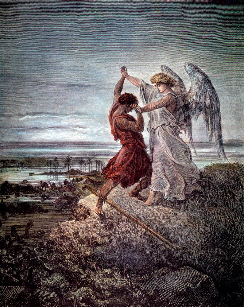 Иаков борется с ангелом Художник: Гюстав Доре Gustave Dore (1832- 1883) Гравюра на дереве, раскрашенная акварелью 1855 Фрагмент. Смотреть полностью.