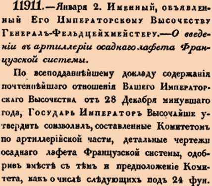 По всеподданнѣйшему докладу содержанія почтеннѣйшаго отношенія Вашего Императоро скаго Высочества отъ 28 Декабря минувшаго года, Государь Императоръ Высочайше утвердить соизволилъ, составленные Комитетомъ по артиллерійской части, детальные чертежи осаднаго лафета Французской системы, одобривъ вмѣстѣ съ тѣмъ и предположеніе Комитета, какъ числѣ слѣдующихъ подъ 24 фун. пушки, 18 фун. и одно-пудоваго единорога лошадей, такъ и относительно запряжки оныхъ, а равно способа возки при лафетахъ этой системы артиллерійской принадлежности.