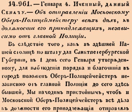 В следствие того, как в здешней Нашей столице по штату для Санктпетербургской Губернии, в 1 день сего Генваря утвержденному, для наблюдения порядка и благочиния в городе положен Обер-Полицмейстер независимо от главной Полиции до сего здесь бывшей, Мы находим пристойным, чтоб и Московской Обер-Полицмейстер все дела к должности его принадлежащия отправлял равным же образом <…>