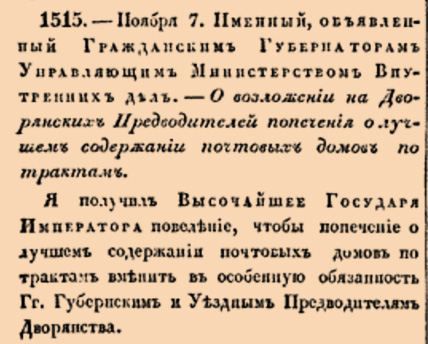 1515. 1827 год. 7 ноября (19 ноября). Именный, объявленный Гражданским Губернаторам Управляющим Министерством Внутренних дел. О возложении на Дворянских Предводителей попечения о лучшем содержании почтовых домов по трактам.