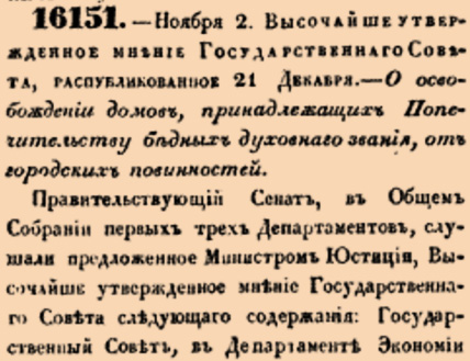 16151. 1842 год. 14 ноября (2 ноября ст.ст.) Высочайше утвержденное мнение Государственнаго Совета, распубликованное 21 Декабря. О освобождении домов, принадлежащих Попечительству бедных духовнаго звания, от городских повинностей. <…> На сем мнении написано: Его Императорское Величество, воспоследовавшее мнение в Общем Собрании Государственнаго Совета относительно освобождения домов от городских повинностей, Высочайше утвердить соизволил <…>