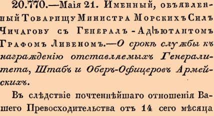 20770. 1803 год. 21 мая (4 июня). Именный, объявленный Товарищу Министра Морских Сил Чичагову с Генерал-Адъютантом Графом Ливеном. О сроке службы к награждению отставляемых Генералитета, Штаб и Обер-Офицеров Армейских