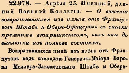 Возвратившихся ныне из плена от Французов под командою Генерал-Майора Барона Меллера-Закомельскаго Штаб и Обер-Офицеров по распределению Высочайшим приказом в полки, повелеваю внести их в списки прежним старшинством, как они до выключки из полков состояли, с тем, что ежели сверстники их произведены уже чинами, то они, оставаясь первыми, своим порядком и производимы теперь будут.