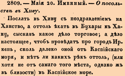 2809. 1714 год. 31 мая (20 мая ст.ст.) Именный. О посольстве в Хиву.Послать в Хиву с поздравлением на Ханство, а оттоль ехать в Бухары к Хану, сыскав какое дело торговое; а дело настоящее, чтоб проведать про город Иркен, сколь далеко оной от Каспийскаго моря, и нет ли каких рек оттоль, (или хотя не от самаго того места, однако ж в близости) в Каспийское море.