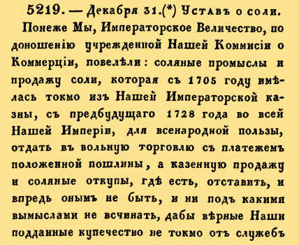 Полное собрание законов Российской Империи, повелением Государя Императора Николая Павловича составленное. Собрание Первое. С 1649 по 12 Декабря 1825 года. Том 7. (1723 — 1727 гг.). 10 декабря (31 декабря ст.ст. 1727) 1728 года. 5219. Устав о соли.