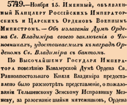По Высочайшему Государя Императора повелению Кавалерской Думе Ордена Св.Равноапостольнаго Князя Владимира предоставлено было разсмотреть представление, о пожаловании Тельшевскому Земскому Исправнику Мезневу, за разогнание шайки мятежников, Ордена Св.Владимира 4 степени с бантом, вместо полученнаго им за сей подвиг таковаго же Ордена без банта <…>