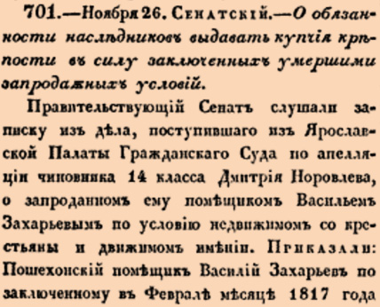 701. 1826 год. 8 декабря (26 ноября ст.ст.) Сенатский. О обязанности наследников выдавать купчия крепости наследников в силу заключенных умершими запродажных условий.Правительствующий Сенат слушали записку из дела, поступившаго из Ярославской Палаты Гражданскаго Суда по апелляции чиновника 14 класса Дмитрия Норовлева, о запроданном ему помещиком Васильем Захарьевым по условию недвижимом с крестьяны и движимом имении <…>