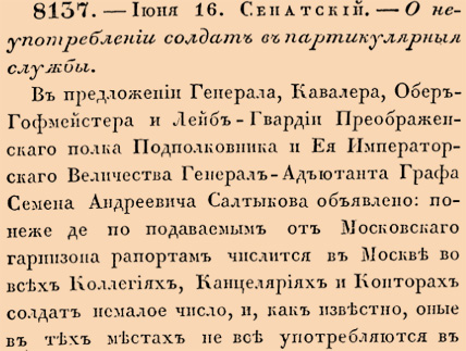 8137. 1740 год. 27 июня (16 июня ст.ст.). Сенатский. О неупотреблении солдат в партикулярныя службы.В предложении Генерала, Кавалера, Обер-Гофмейстера и Лейб_гвардии Преображенскаго полка Подполковника и Ея Императорскаго Величества Генерал-Адъютанта Графа Семена Андреевича Салтыкова объявлено: понеже де по подаваемым от Московскаго гарнизона рапортам числится в Москве во всех Коллегиях, Канцеляриях и Конторах солдат немалое число, и, как известно, оные в тех местах не все употребляются в надлежащих службах, но берутся в домы судейские на караулы, а за другими ездят по Москве, да еще драгуны и на лошадях полковых тоже принуждены за ними отправлять <…>