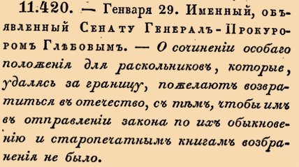 11.420. — Генваря 29. Именный, объявленный Сенату Генералъ-Прокуроромъ Глѣбовымъ. — О сочиненіи особаго положенія для раскольниковъ, которые, удалясь за границу, пожелаютъ возвратиться въ отечество, съ тѣмъ, чтобы имъ въ отправленіи закона по ихъ обыкновенію и старопечатнымъ книгамъ возбраненія не было.