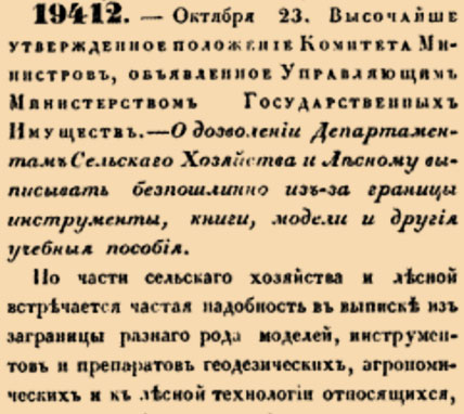 19412.—Октября 23. ВЫСОЧАЙШЕ УТВЕРЖДЕННОЕ ПОЛОЖЕНІЕ КОМИТЕТА Министровъ, объявленное Управляющимъ Министерствомъ Государственныхъ Имуществъ. — О дозволеніи Департаментамъ Сельскаго Хозяйства и Лѣсному выписывать безпошлинно изъ-за границы инструменты, книги, модели и другія учебныя пособія.