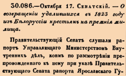 30.086.—Октября 17. СЕНАТСКІЙ. — О возвращеніи удалившихся въ 1823 году изъ Бѣлоруссіи крестьянъ на прежнія жилища.