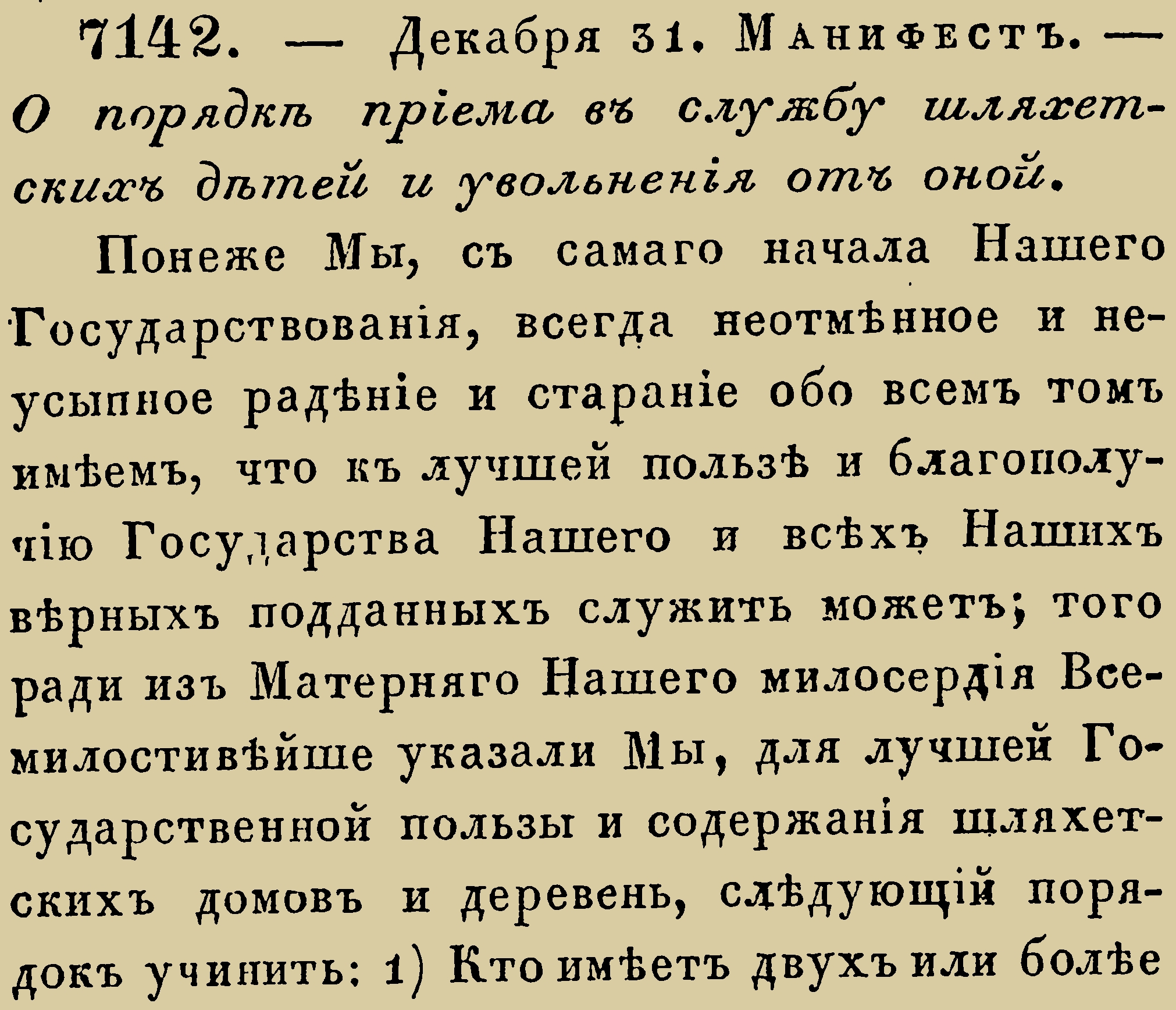 7142.- Декабря 31. Манифестъ. О порядкѣ пріема въ службу шляхетскихъ дѣтей и увольненія отъ оной.