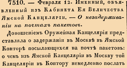 Доношеніемъ Оружейная Канцелярія представляла о задержаніи въ Москвѣ въ Ямской Конторѣ посылающихся на почтѣ пакетовъ: о чемъ изъ Ямской Канцеляріи въ Москву той й Канцеляріи въ Контору немедленно послать указъ съ крѣпкимъ подтвержденіемъ, дабы оная впредь такого задержанія не учинила.