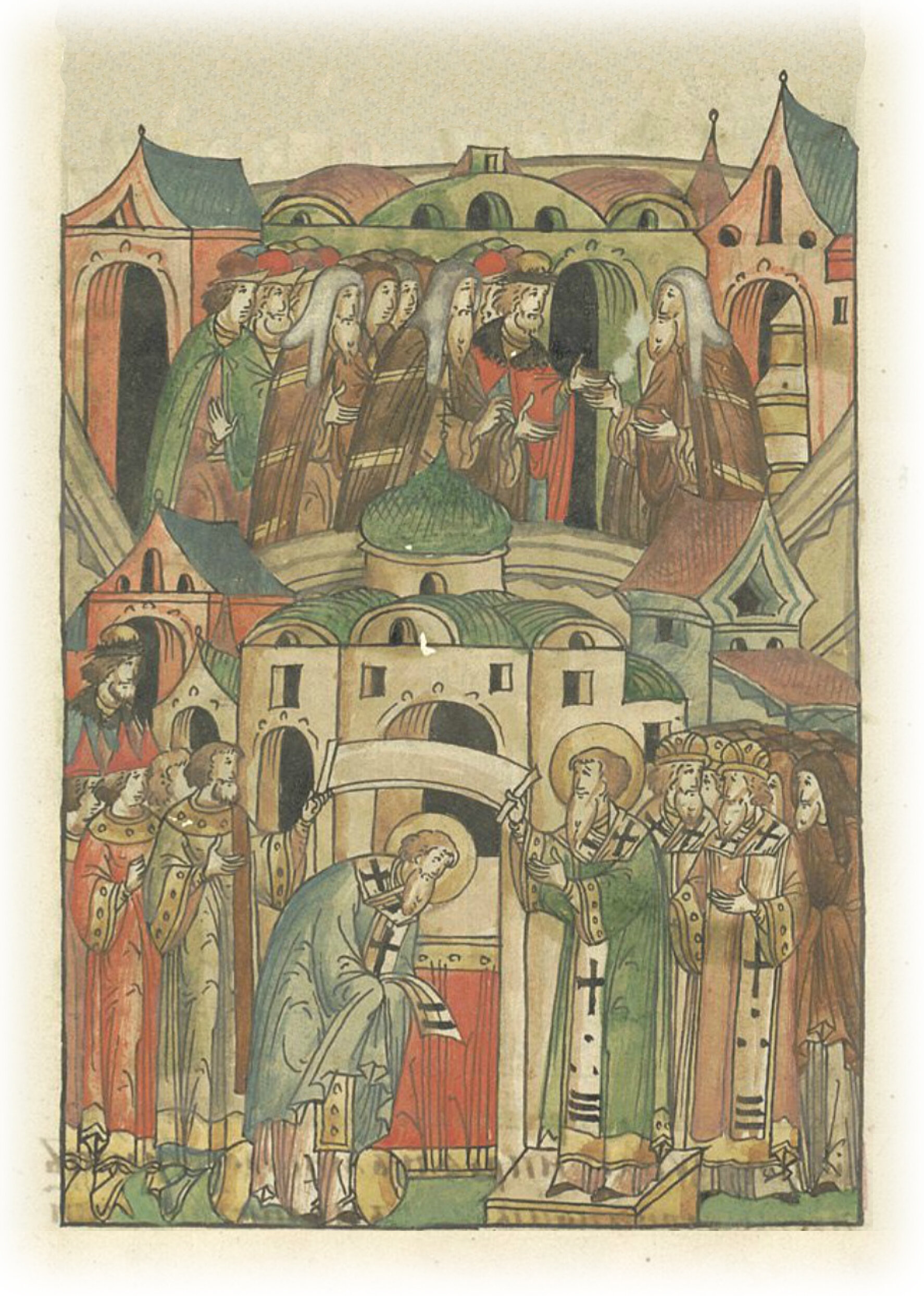 И едва умолили митрополичьего протодьякона Арсения стать епископом в Твери, так как он боялся вражды и войны. И едва уговорили его, и возвели его в епископский сан месяца августа в 15 день.