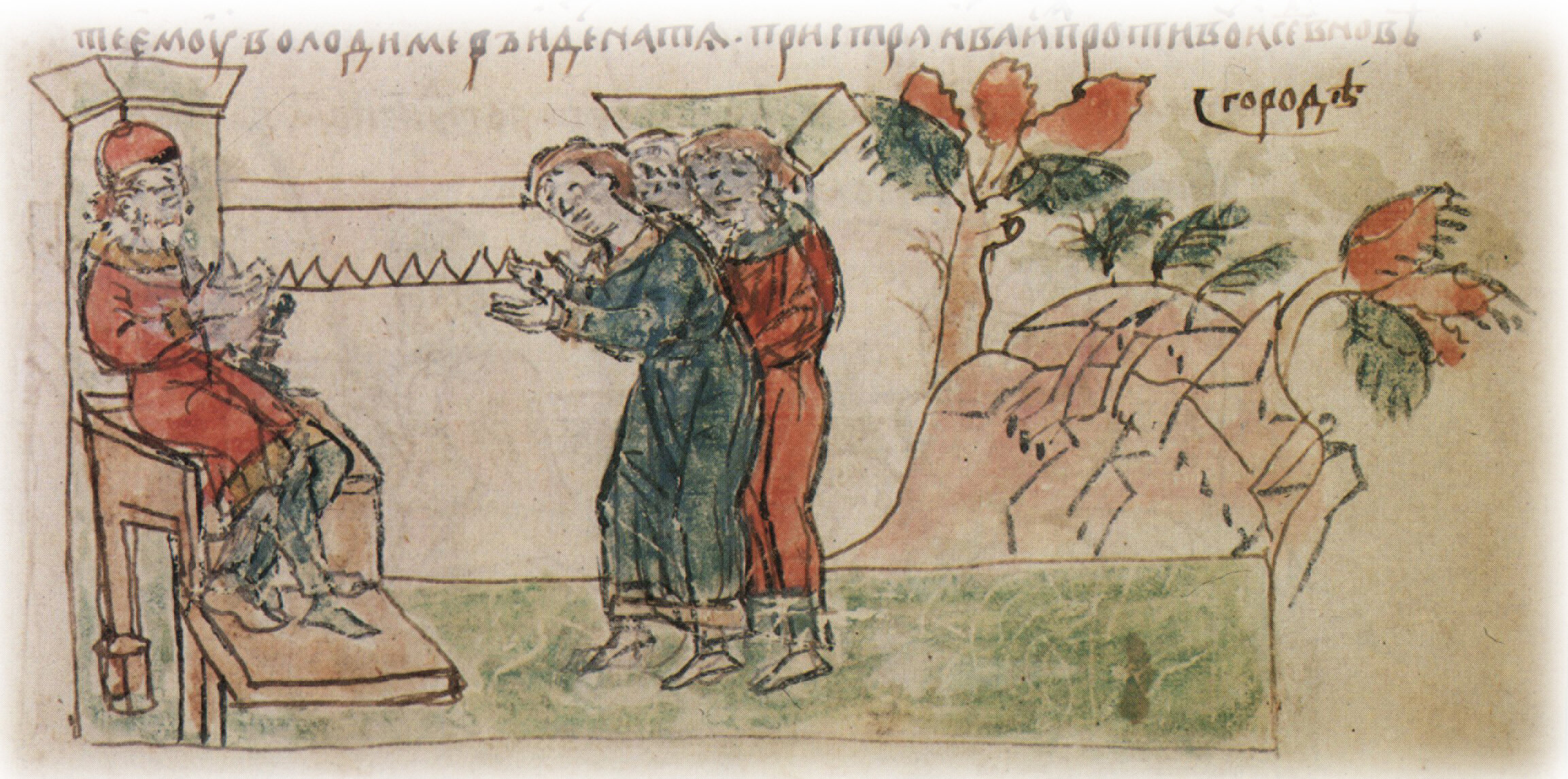 "В лето 6488. И прииде Володимер с варягы к Новугороду, и рече посадником Ярополним: «Идите ко брату моему и рците ему: Володимер идет на тя, пристраивайся противу». И седе в Новегороде".