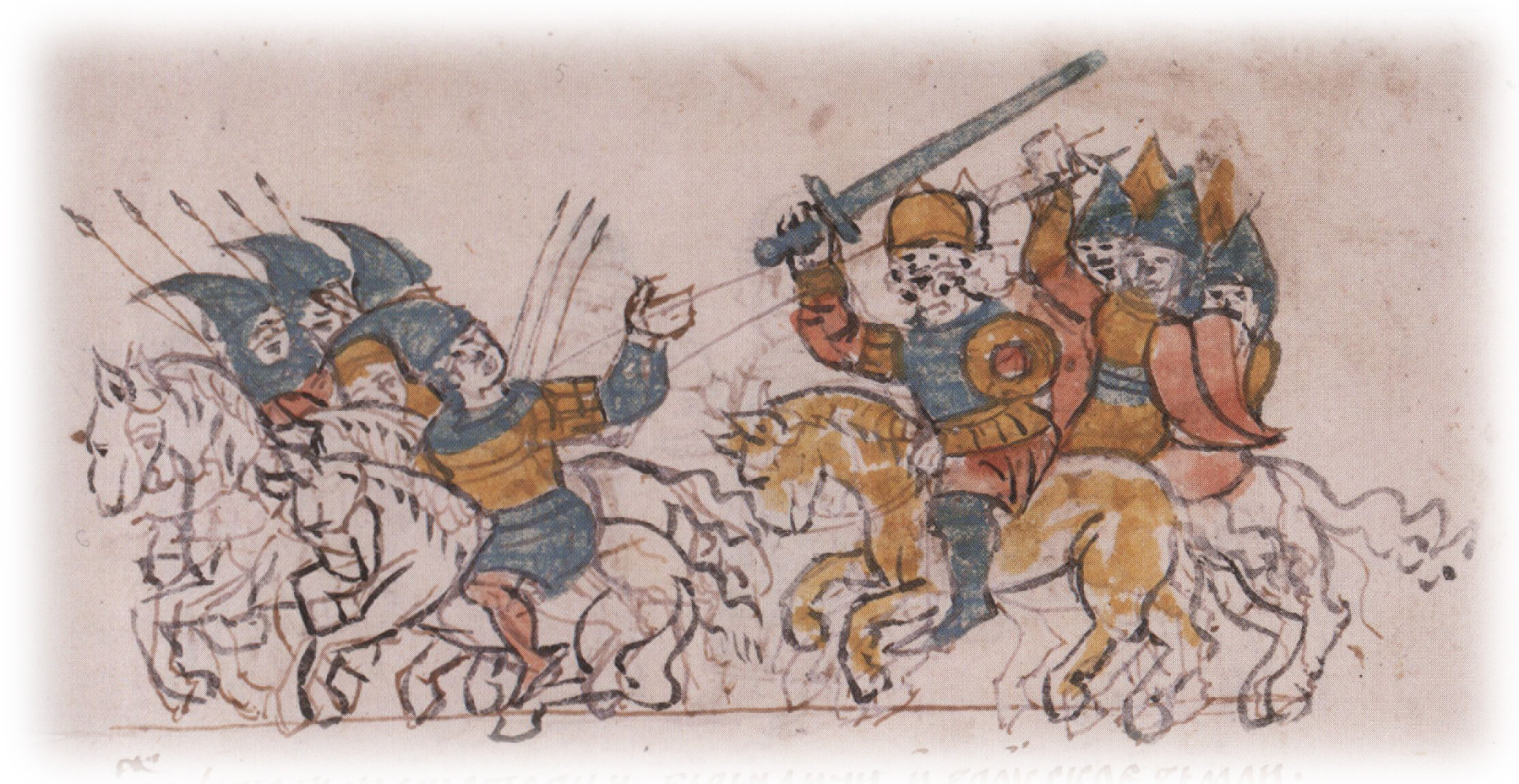 Рисунок "мастера Б" — перо. Правлен (фигуры, лица, шапки, шлемы, копья, щиты, лошади) и дополнен (меч) "мастера В" — кисть