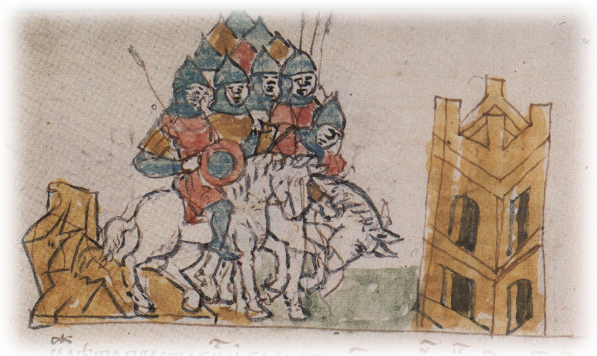 Рисунок "мастера Б" — перо. Правлен (фигуры, лица, шлемы, наконечники копий, щит, архитектура, лошади, лещадка) "мастера В" — кисть.