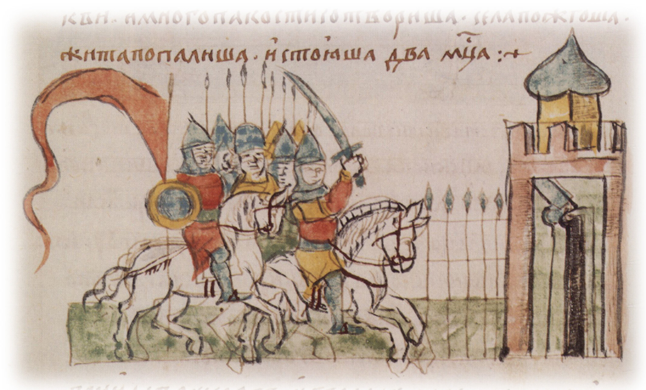 Рисунок "мастера Б" — перо. Правлен (фигуры, отдельные лица, шапка, шлемы, сабля, наконечники копий, щит, архитектура, лошади) и дополнен (знамя) "мастера В" — кисть. Позднейшая пририсовка сбруи и стремян — перо.