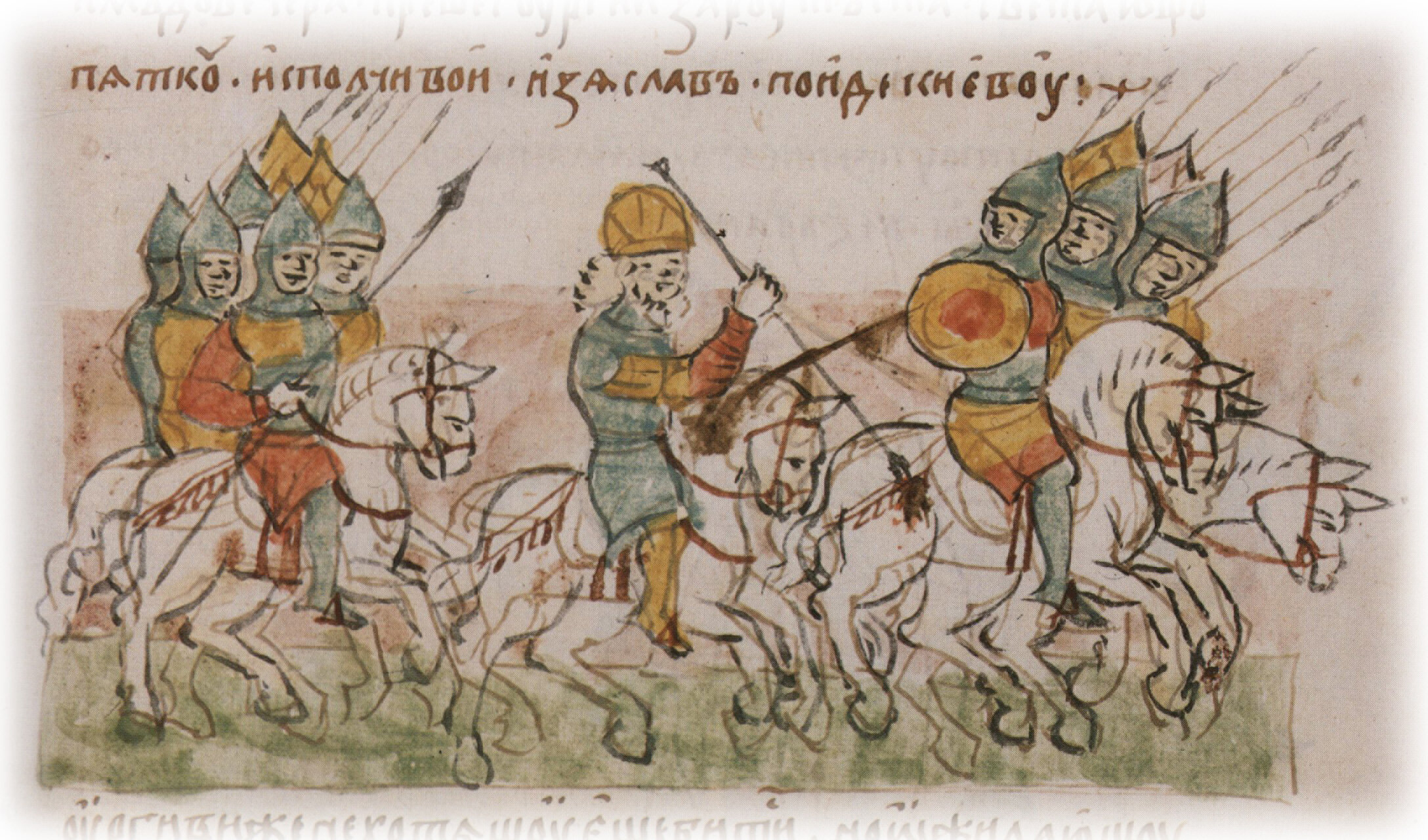 "...Андрей же нача рядити полки отца своего, и возма копье и соехася преже, и изломи копие свое. Тогда же бодоша конь под ним в ноздри...".