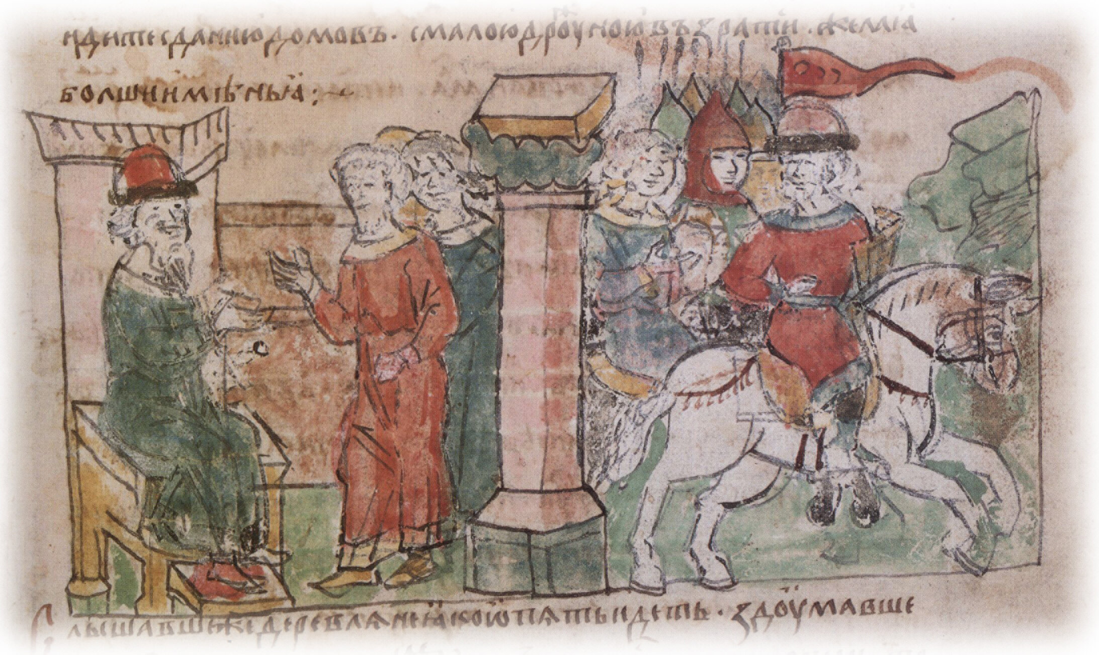 "И послуша их Игорь, иде в деревляны в дань, и примышляше ко первой дани, и насиляше им, и мужи его. И возма дань, и поиде в град свой. Идущи же ему воспять, размыслив, рече дружине своей: «Идите с данию домов». С малою дружиною възратися, желая болши именья".