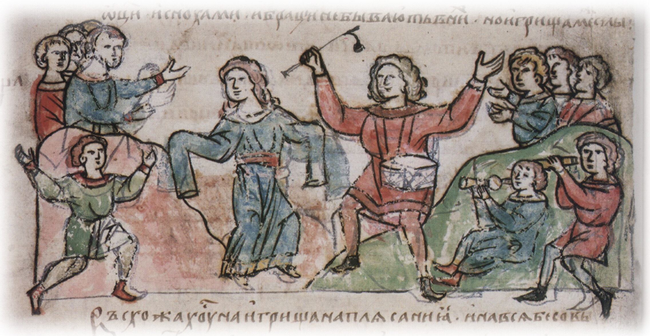 "...но игрища меж селы. Въсхожахуся на игрища, на плясания и на вся бесовьскаа песни...".Слева подпись к рисунку: "Игрища".