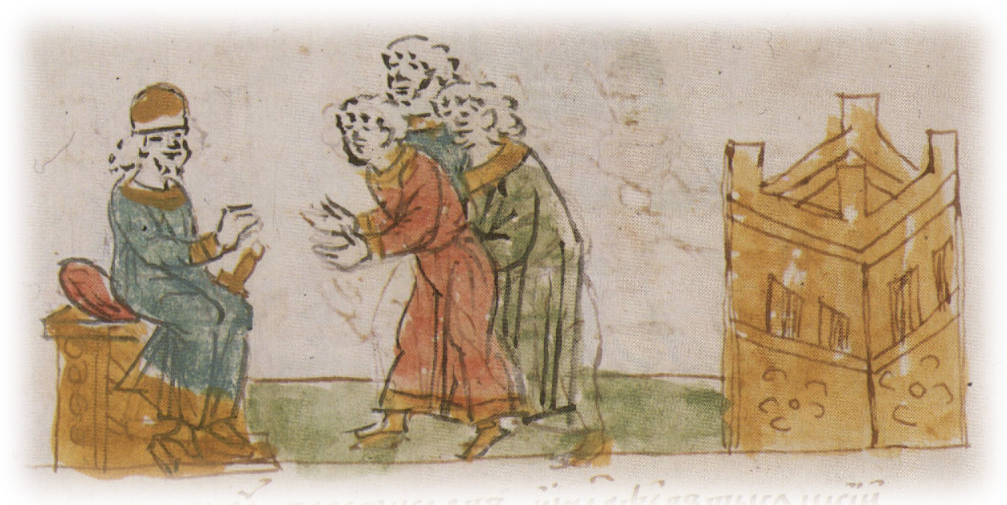 Рисунок "мастера Б" — перо. Правлен (фигуры, лица, шапка, стол) "мастера В" — кисть.