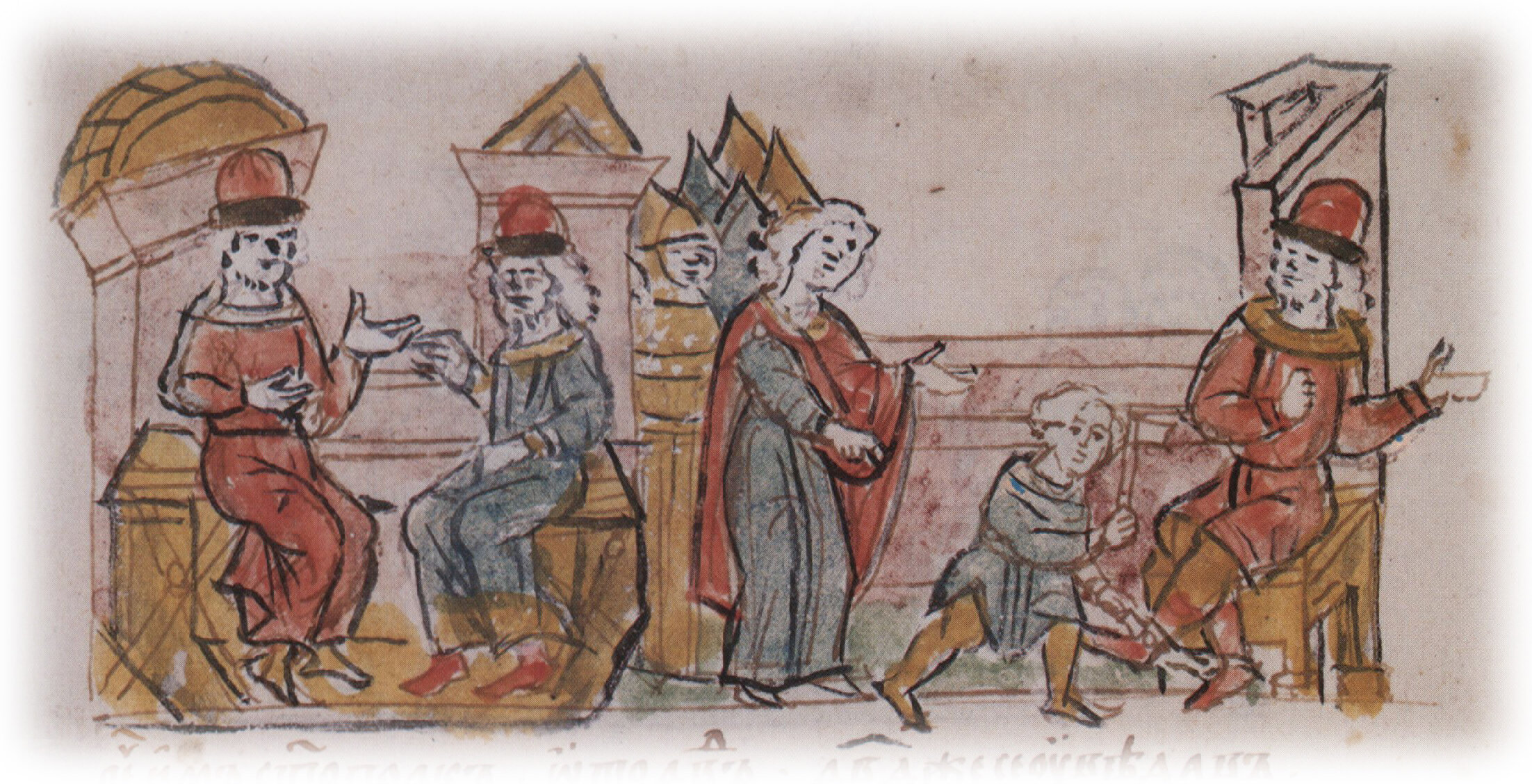 Рисунок "мастера Б" — перо. Правлен (фигуры, лица, шапки, шлемы, столы, архитектура) и дополнен (архитектура справа) "мастера В" — кисть.