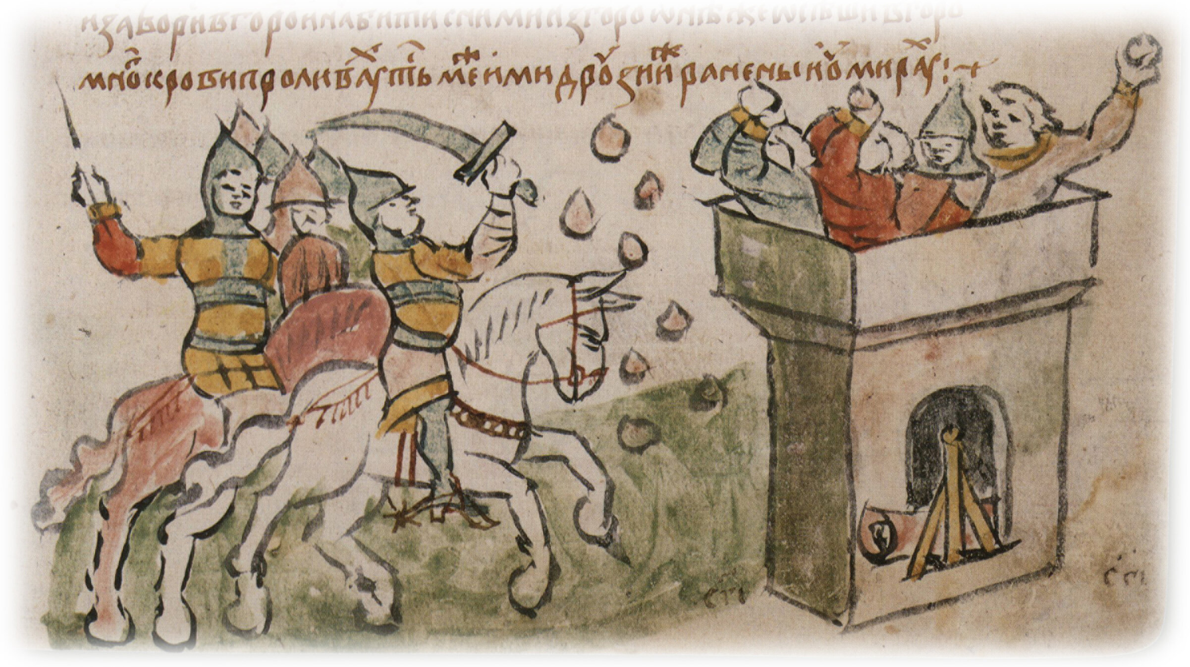 Рисунок "мастера В" — кисть. Позднейшая пририсовка сбруи и стремени — перо. Еще более поздняя пририсов ка сбруи, Сапунов Б. В. Миниатюры Радзивиловской летописи о походе Игоря на половцев // Книга в России XVI — середины XIX вв. Материалы и исследования