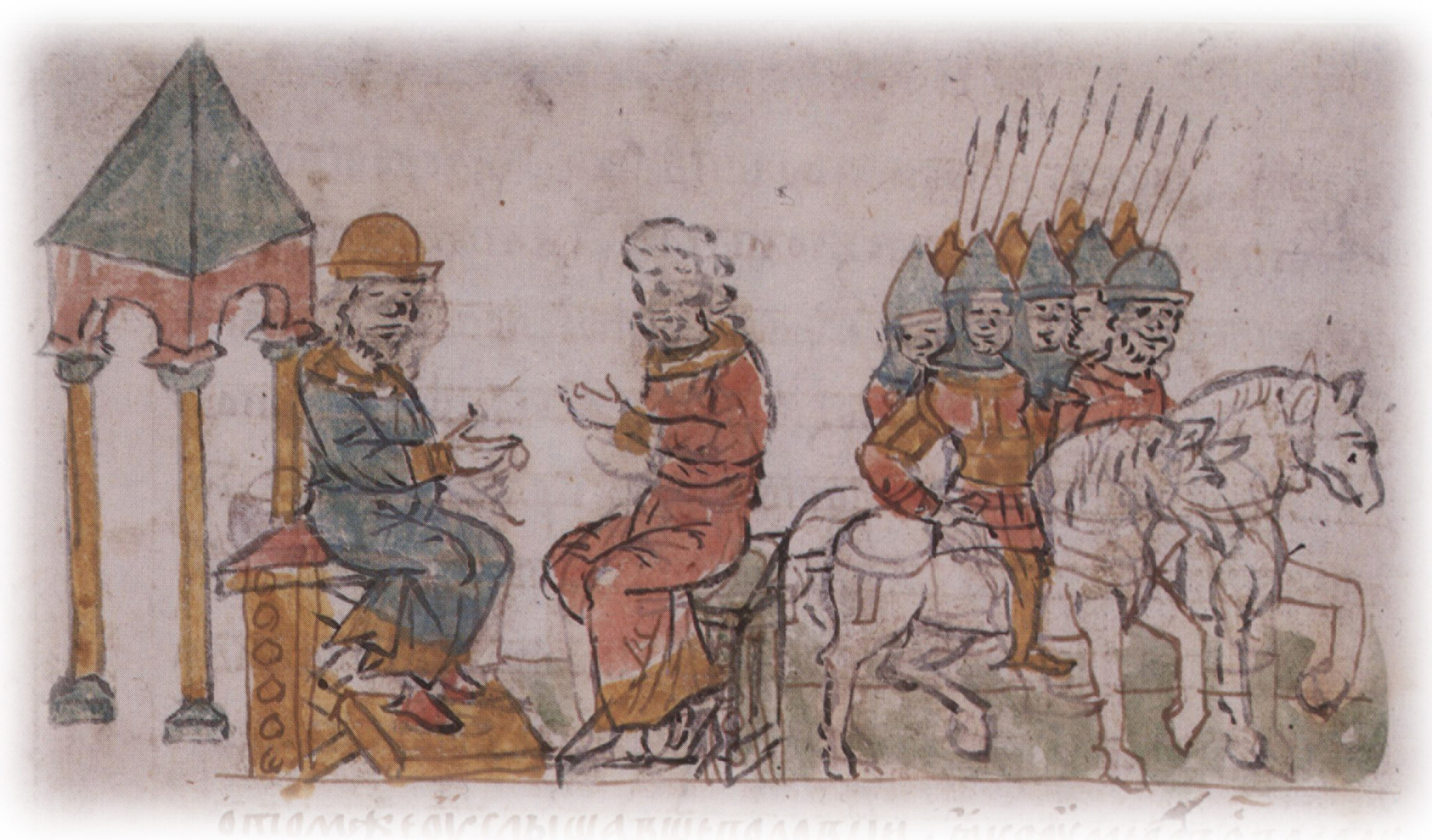 Рисунок "мастера Б" — перо. Правлен (фигуры, лица, наконечники копий, столы, лошади) и дополнен(киворий) "мастера В" — кисть.
