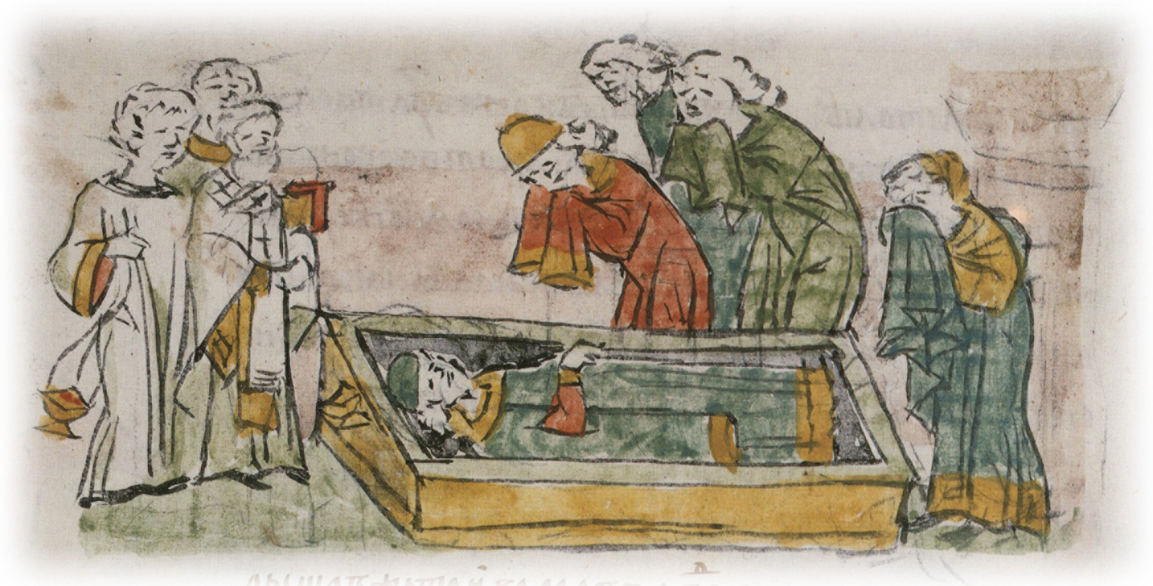 Тайное погребение Владимира Святославича, умершего в Берестове: спуск его тела на землю на ковре между разобранными клетьми здания; положение тела Владимира в мраморный гроб в церкви Святой Богородицы.