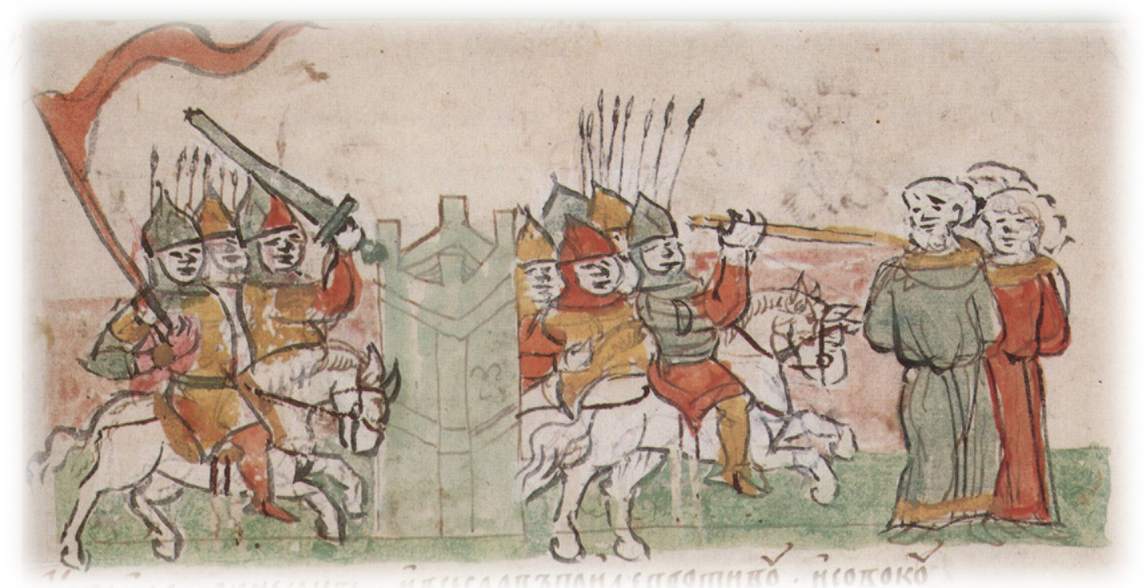 Рисунок "мастера Б" * — перо. Правлен (фигуры, лица, шлемы, меч, копья, лошади) и дополнен (знамя, копье справа) "мастера В" — кисть. Позднейшая пририсовка сбруи и стремян — перо.