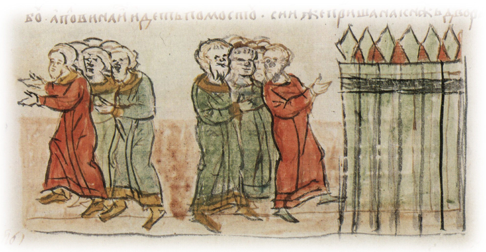 "И разделишася надвое; половина их идет к погребу, а половина их идеть по мосту. Сии же придоша на княжь двор".