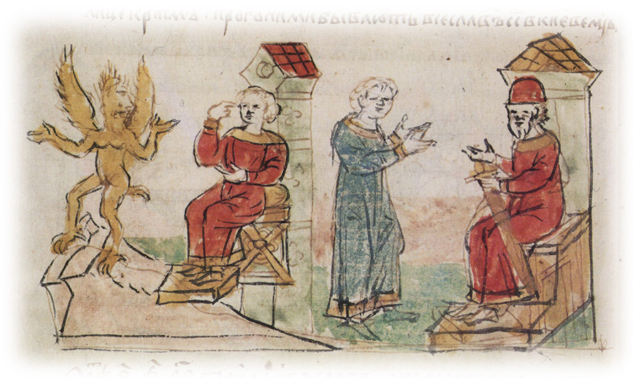 Рисунок "мастера Б" — перо. Правлен (фигуры, лица, шапка, меч, столы, архитектура, лещадка) "мастера В" — кисть.