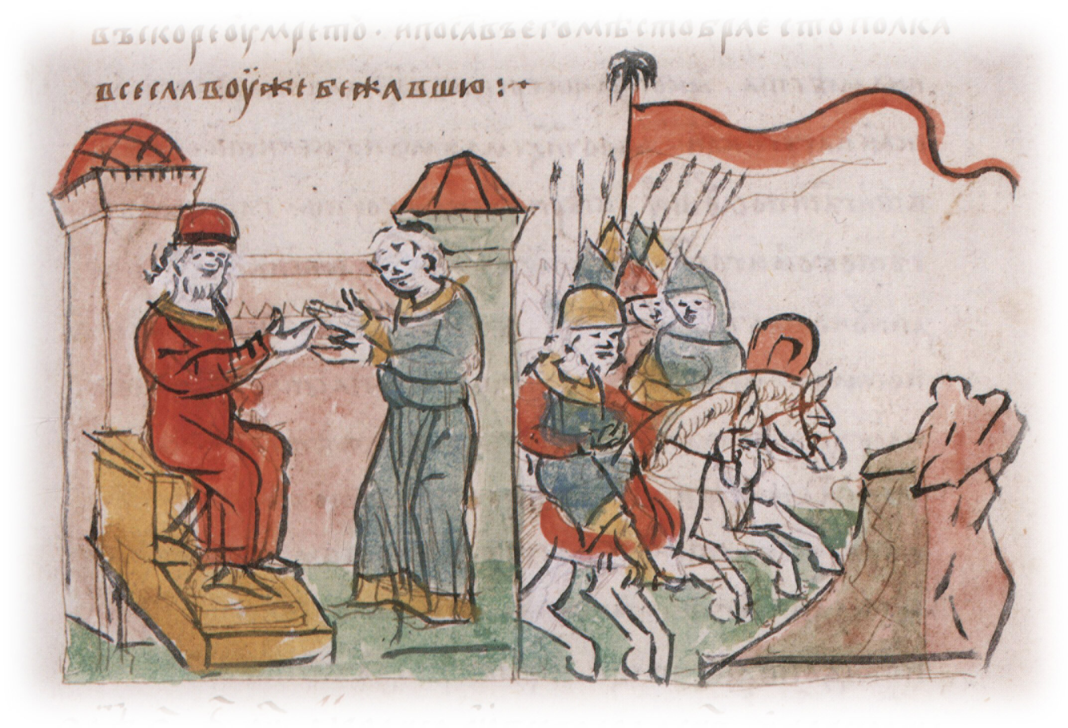 "Изяслав же... посади сына своего Мстислава в Полоцку, иже въекоре умре ту. И посади в его место брата его Святополка, Всеславу же бежавшю".