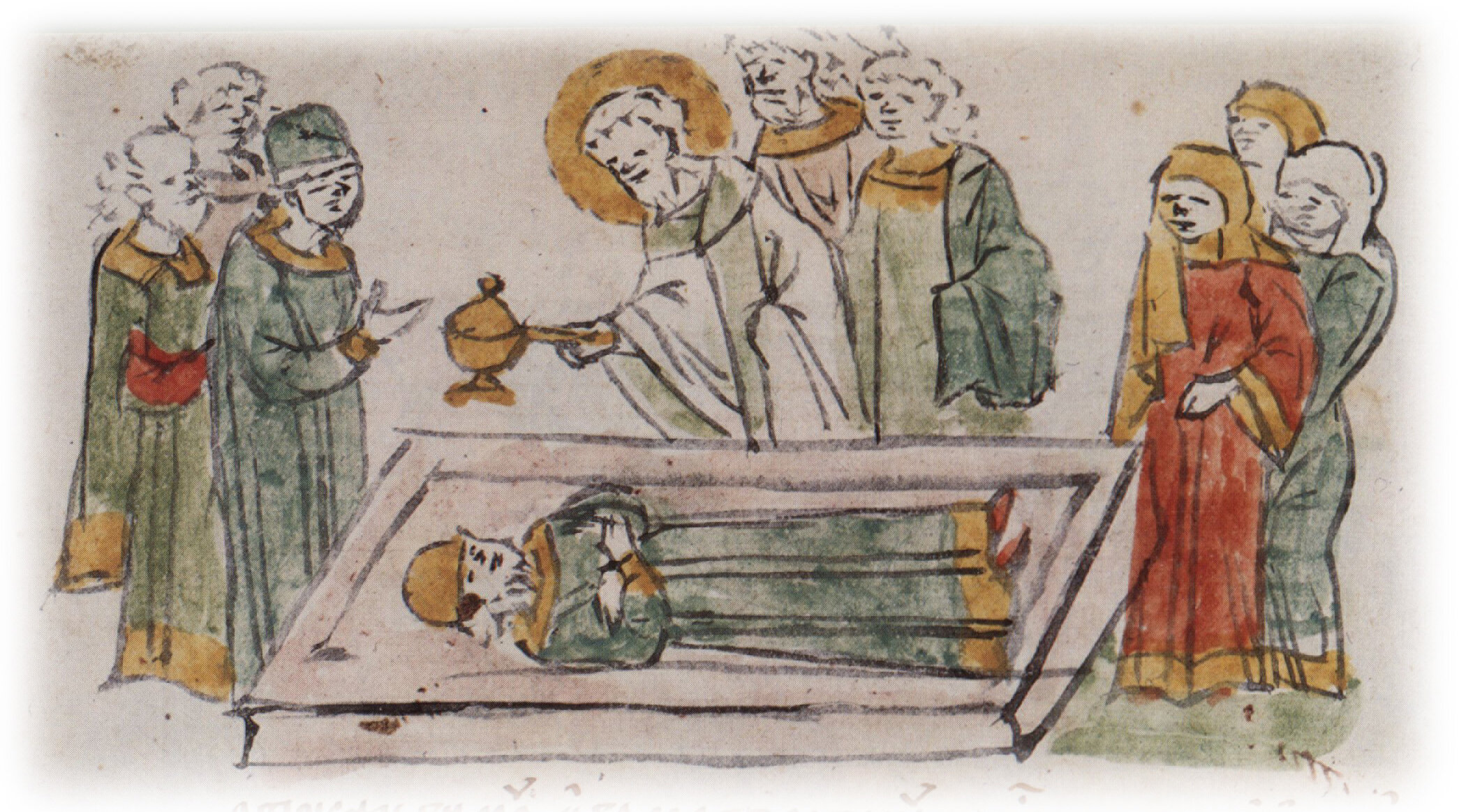 Тайное погребение Владимира Святославича, умершего в Берестове: спуск его тела на землю на ковре между разобранными клетьми здания; положение тела Владимира в мраморный гроб в церкви Святой Богородицы.