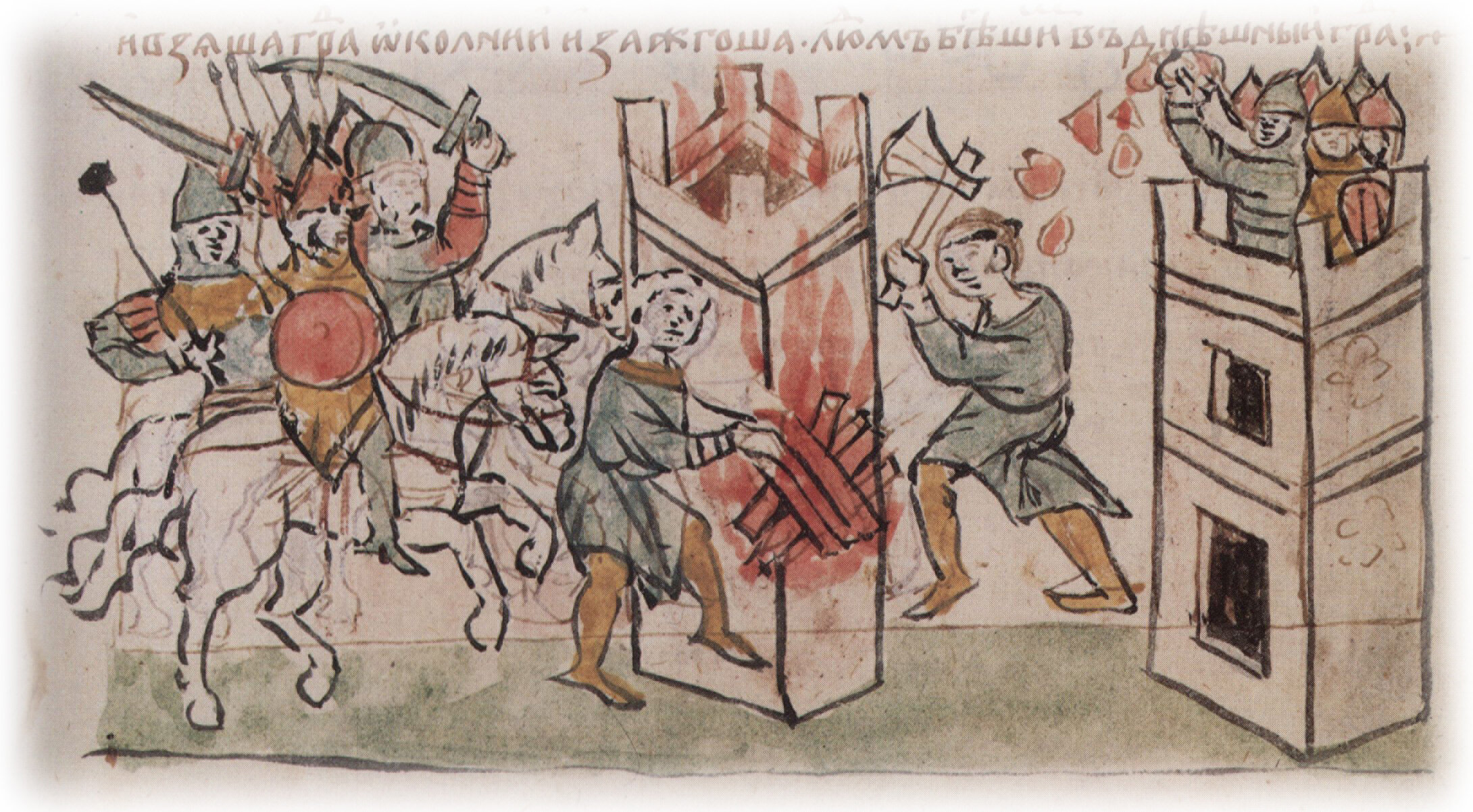 "Поиде Изяслав со Ярополком, сыном своим, и Всеволод своим сыном Володимером. И поидоша к Чернигову. Володимер же приступи ко вратом восточным, от Стрежене, и отъя врата и взяша град околний, и зажгоша, людем бегшим в днешный град".